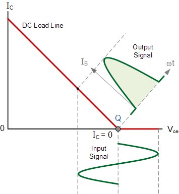 乙类放大器在静态时无直流偏置电流,其晶体管偏置在截止区(Cut-off Region)。因此,只有当输入信号电压大于晶体管的基-射极电压(约0.7V)时才导通。当输入为零时,输出也为零,不消耗功率。乙类放大器的工作点(Q点)位于负载线所示。