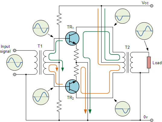 当无输入信号时,两只晶体管均处于截止边缘,仅流过极小静态电流(由基极偏置确定)。如果输入变压器中心抽头精确对称,则两集电极电流方向相反,不会在变压器铁芯中形成净磁化电流,从而减少失真。