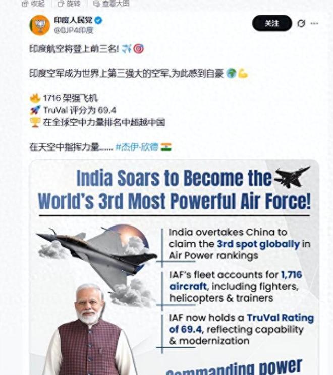 美国智库最近搞了个全球空军排名,直接把印度捧成了世界第三,咱们却被甩到了第七,这结果一出来,印度那边可是炸了锅,官方带头庆祝,网友更是感觉“赢麻了”。