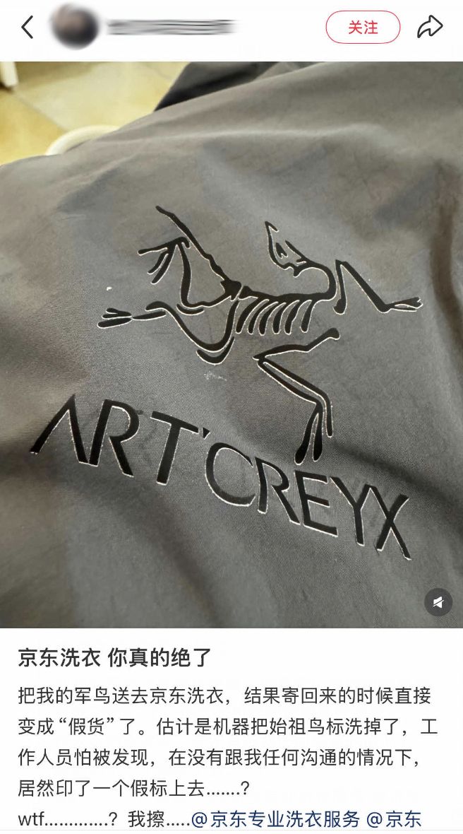 上周,有网友发帖吐槽,说把一件“军鸟”(始祖鸟军用产品线)送到京东洗衣,结果洗完寄回来,喜提“假货”——品牌名Arcteryx变成了Artcreyx。字母还是那些字母,但排列组合出了新的Art。