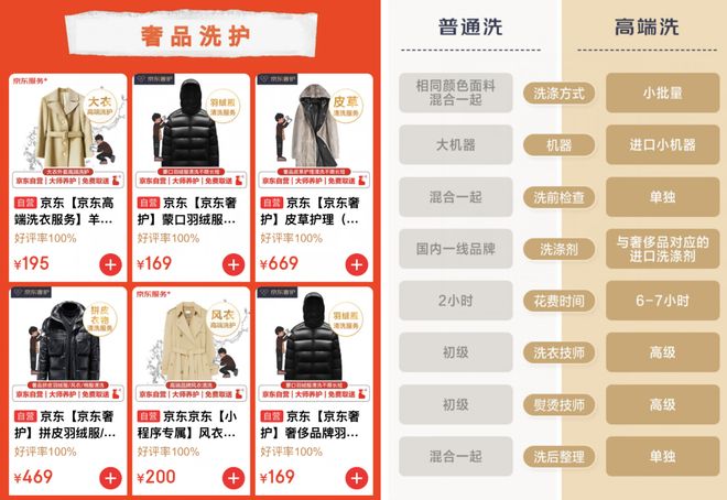 服务以2000元为界线,分为普通洗和高端洗。普通洗任洗两件羽绒服或两件大衣都能75元拿下,平台同时会提醒你,不要送价值2000元以上的衣物;高端洗则一件羽绒服169元,一件大衣195元,皮草更是要669元。